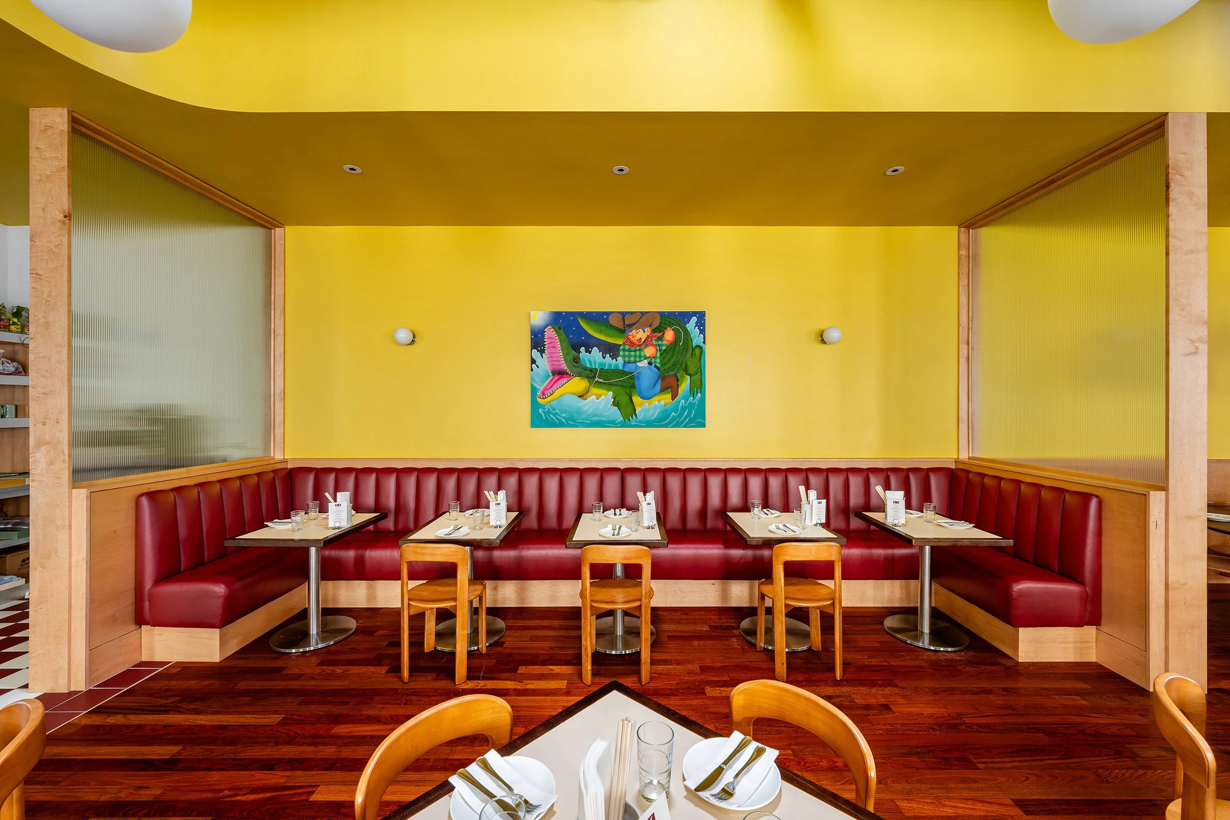 Situated under artist Loc Huynh's "Midnight Gator Wranglin'," our banquette seating can accommodate 8 - 16 guests and is an upscale diner setting for any special occassion. While the banquette is in our main dining room, it's nestled between two partitions with a view of the kitchen pass for any “The Bear” enthusiasts.