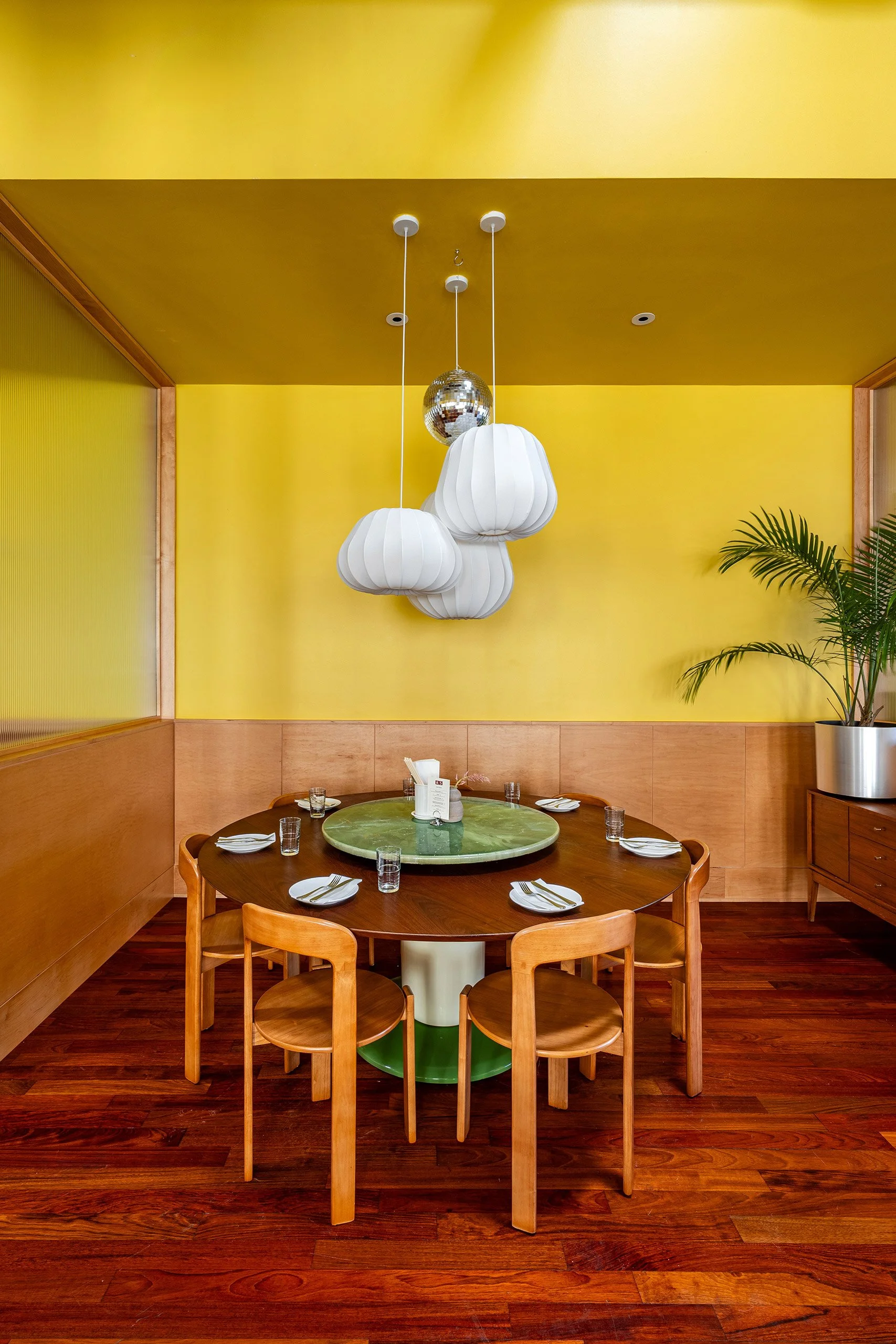 Fondly named "Big Suzy," our elegant yet fun lazy susan table can accommodate up to 10 guests comfortably (12 if you really like each other) and perfect for celebrations, big and small. The Chinese banquet-style round table is in our main dining room, nestled under lantern chandeliers and between two partitions. It's the perfect blend of cozy while still feeling like your party is a part of the hustle and bustle of service.
